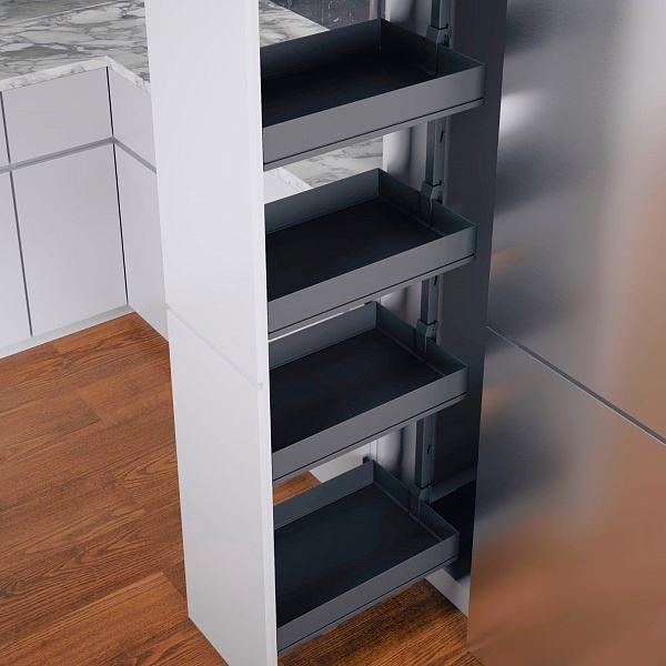 • Высокая нагрузка на механизм в 100 кг (по 18 кг на полку) позволяет организовать хранение большому количеству предметов, при этом даже при полной загрузке система выдвигается легко.
